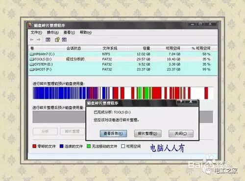 ③C盤屬性→工具→碎片整理→【開始整理】→選中C盤→【碎片整理】(勿開其他程序)