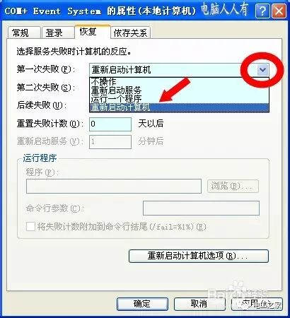 這個工作量比較大一些,但是對不明重啟現象,有時候也很奏效 。依次雙擊所有已經啟動的服務項,看它的屬性回複中是否選擇了重新啟動計算機?如是,取消此項,觀察是否因為這個原因導致操作係統重啟 ?